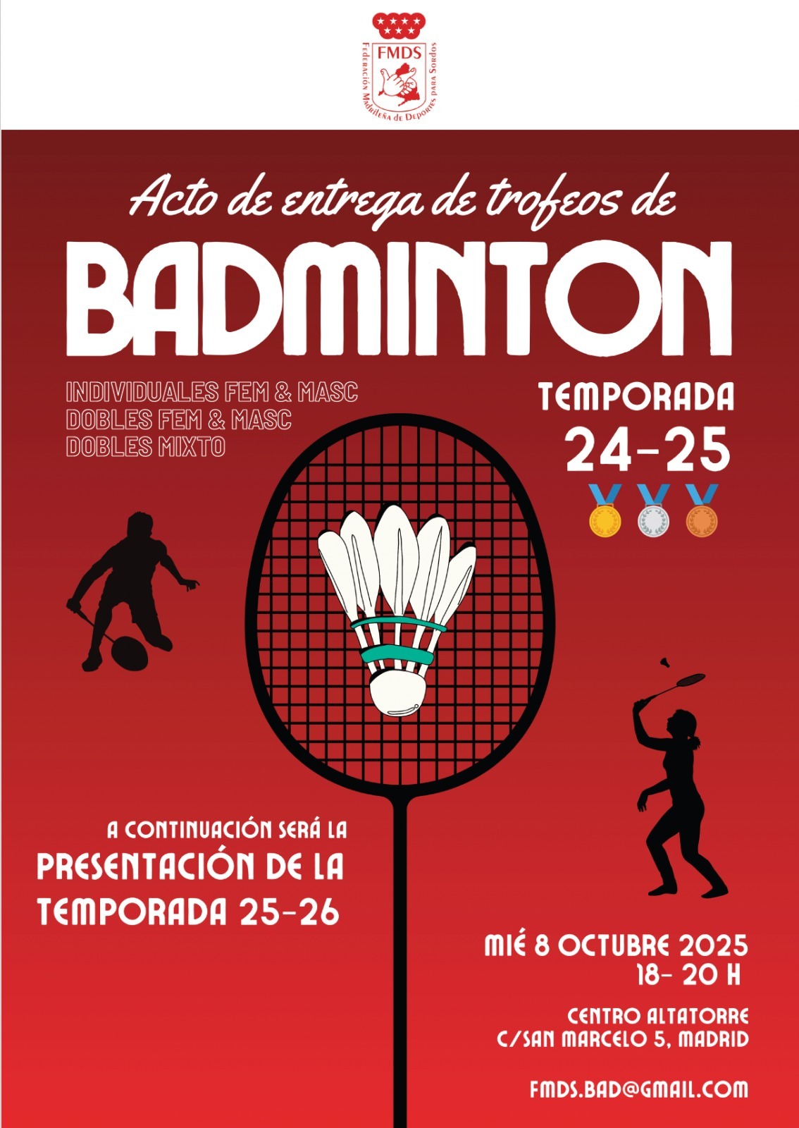 18:00 - 20:00Acto de entrega de trofeos de Bádminton de la temporada 2024/25 Centro Altatorre Eventos para 9 octubreSin eventosEventos para 10 octubreSin eventosEventos para 11 octubreSin eventosEventos para 12 octubreSin eventos